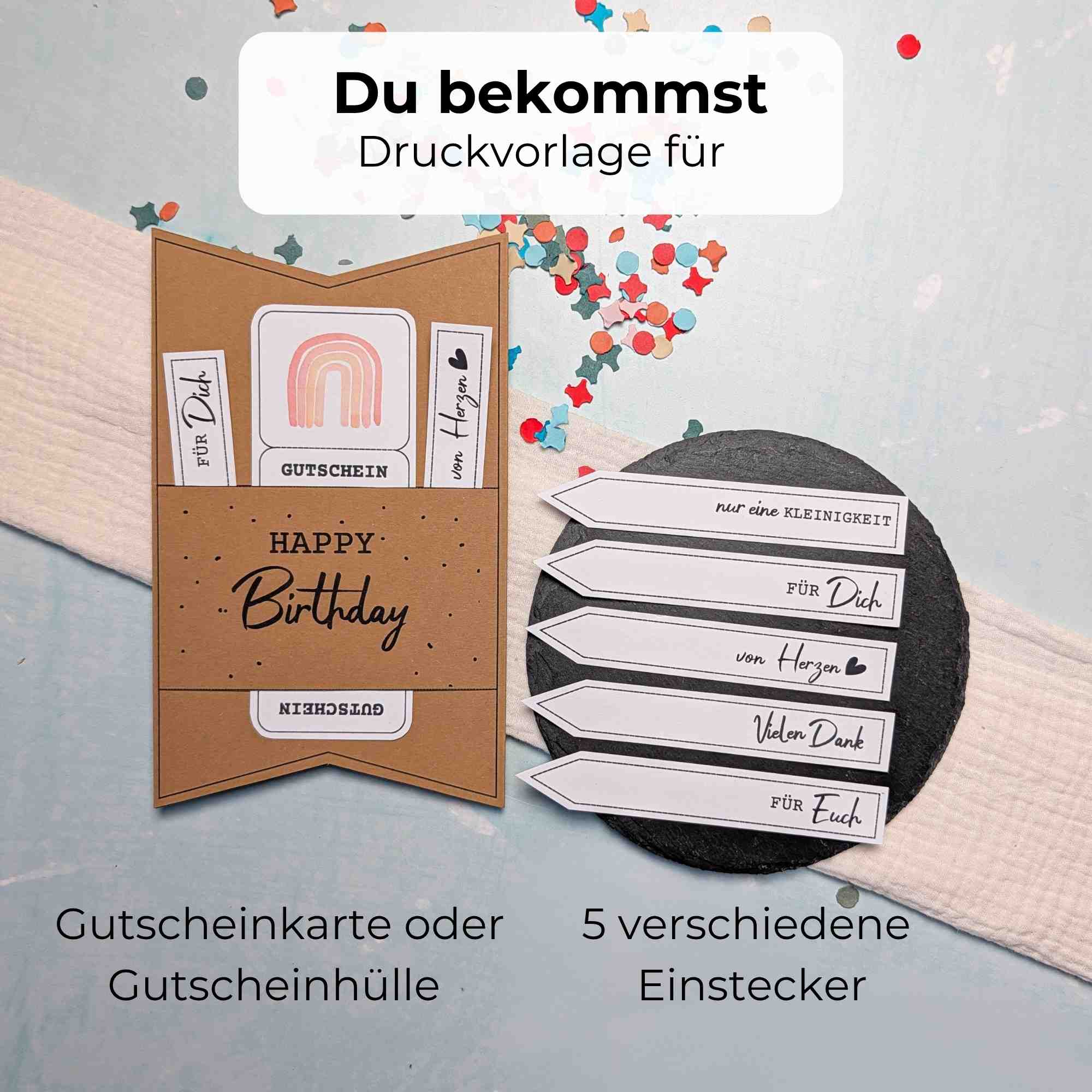 Liebevoll gestaltete Druckvorlage für eine Geburtstagsgutschein Karte als passende Verpackung für deinen Geschenk-Gutschein 🎉🎁