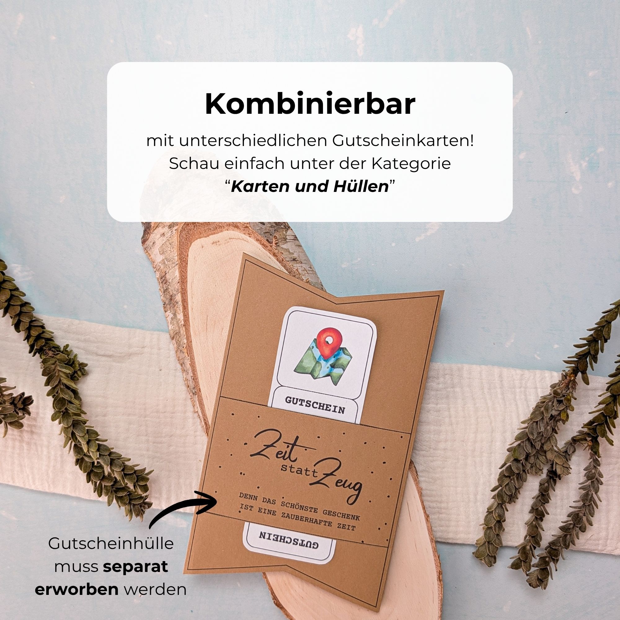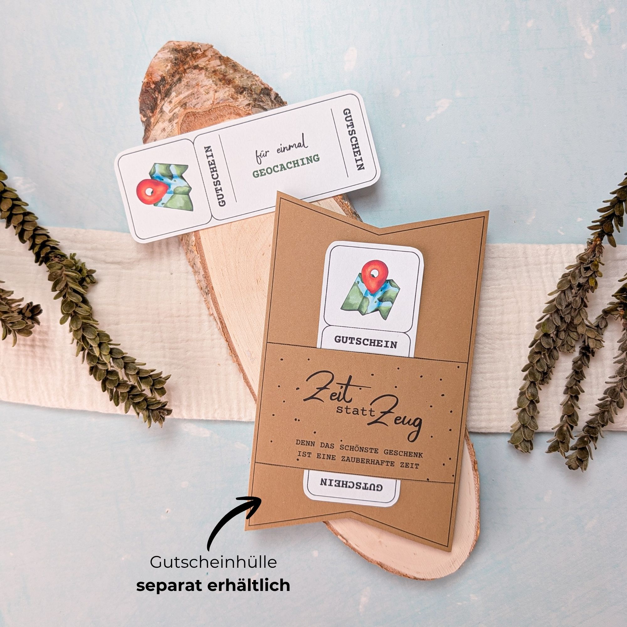 Kombiniere die Geocaching Gutschein Vorlage mit einer passenden Gutscheinkarte oder -hülle aus meinem Shop. Hier im Beispiel steht auf der Gutscheinverpackung „Zeit statt Zeug. Denn das schönste Geschenk ist gemeinsame Zeit.“
