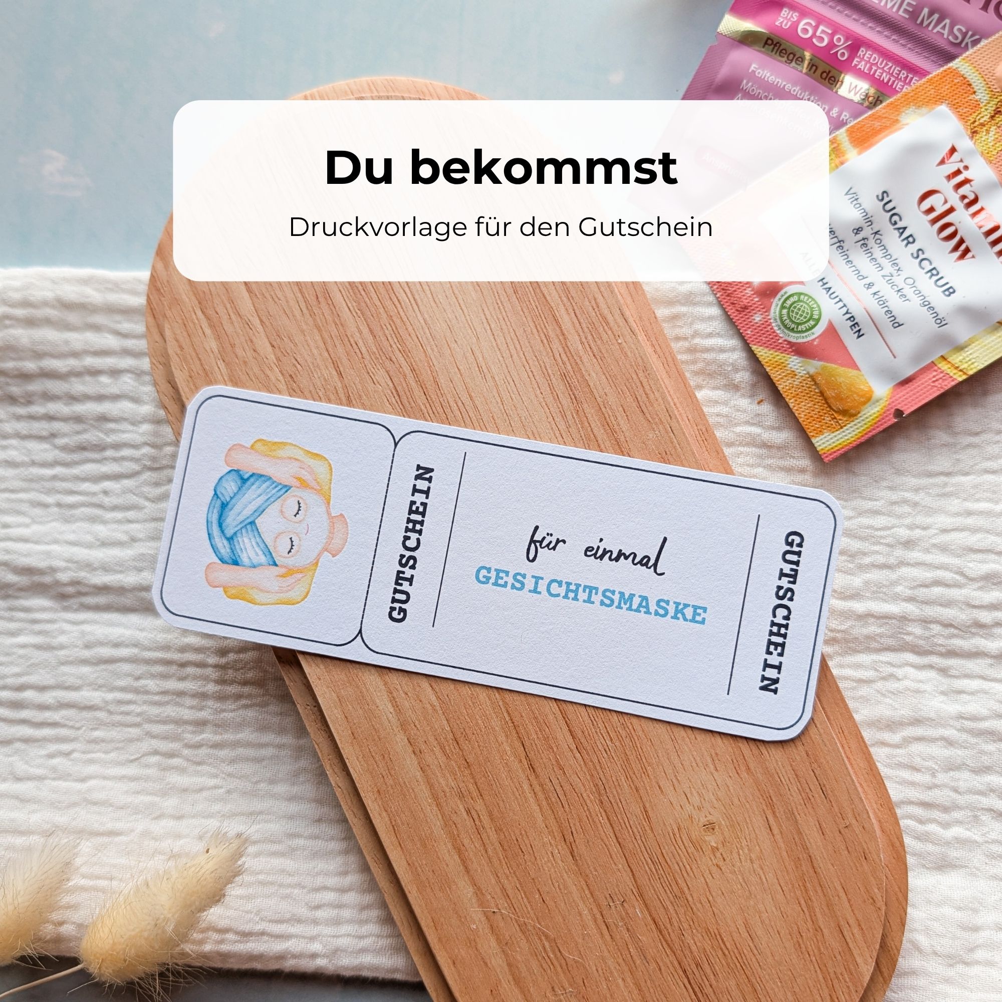 Die Gesichtsmaske Gutschein Vorlage kommt als fertige PDF direkt zu dir. Einfach ausdrucken, ausschneiden, verschenken – und direkt jemanden glücklich machen. Gerade wenn's schnell gehen muss, ist das eine runde Sache. Ohne Bastelstress, aber mit echter Wirkung – denn du verschenkst einen Moment, der gut tut.