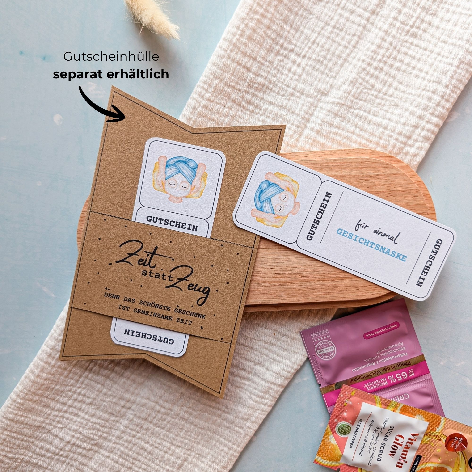 Verpacke den Gesichtsmaske Gutschein zusammen mit einer kleinen Pflegeprobe, einem Mini-Handtuch oder einer Gesichtsmaske aus dem Drogeriemarkt. So wird das Geschenk nicht nur nützlich, sondern auch besonders charmant.