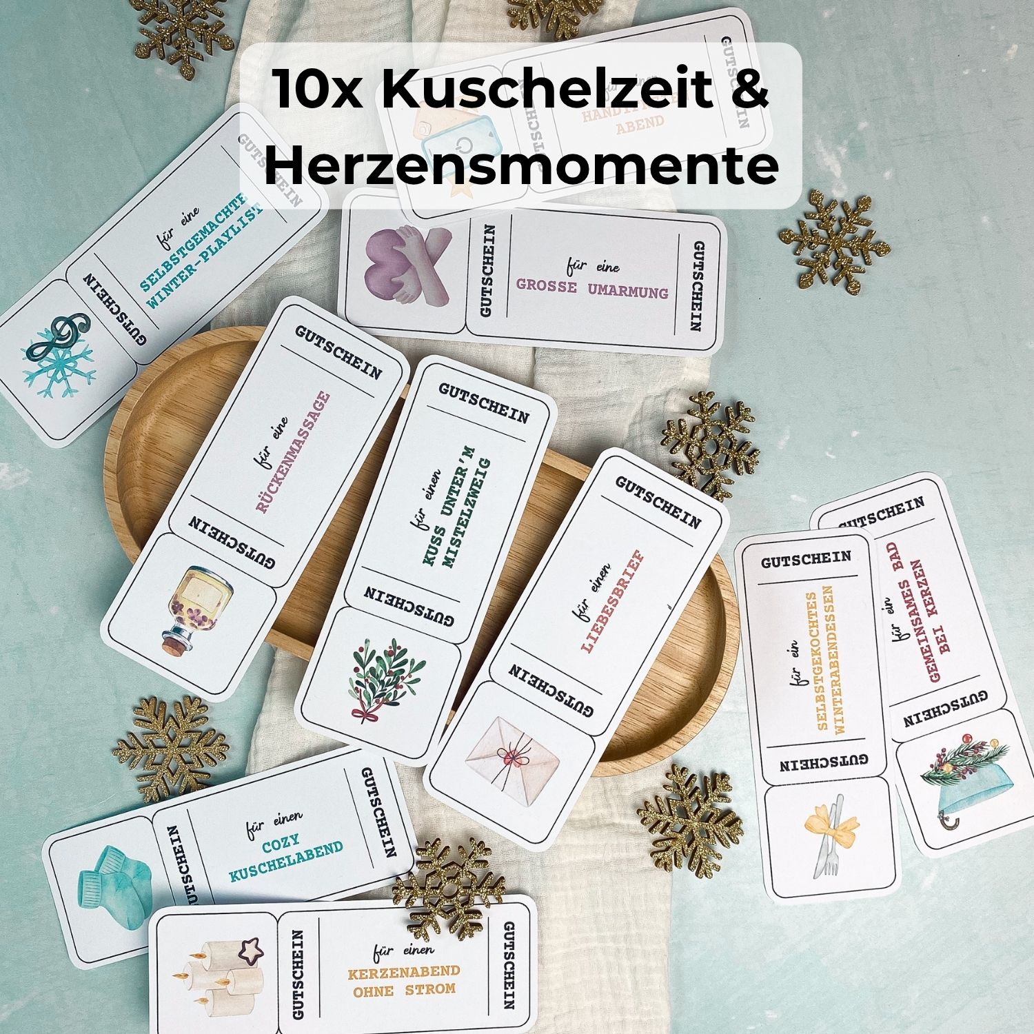 Liebevoll gestaltete Gutscheine für Paare – Adventskalender Ideen für Zweisamkeit und ruhige Winterabende.