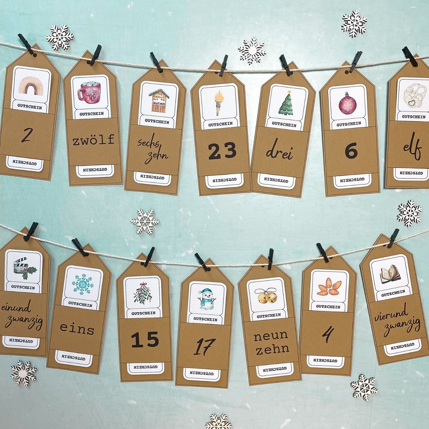 Auch die Gutscheine werden ganz einfach ausgedruckt & ausgeschnitten. Jetzt musst du nur noch jeden Gutschein in seine passende Zahl stecken, alles an einer Schnur aufhängen – und fertig ist dein ganz persönlicher Adventskalender.