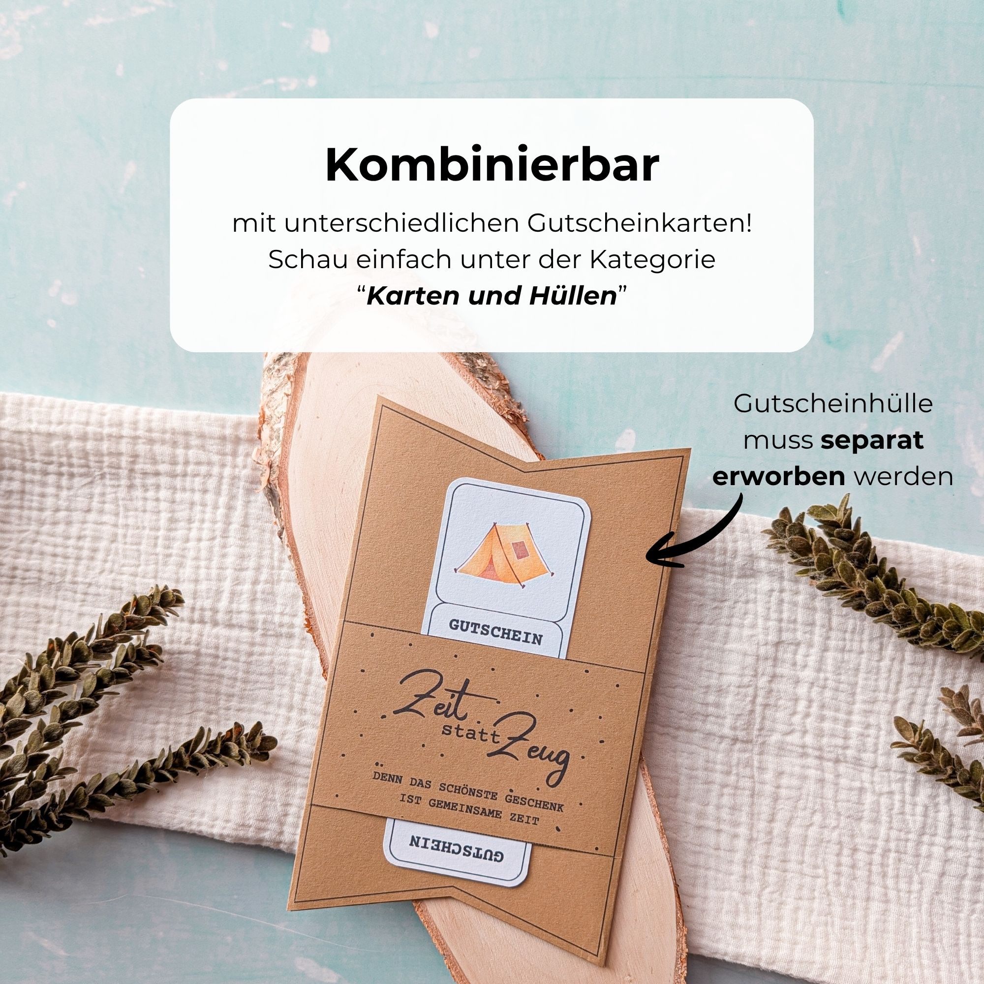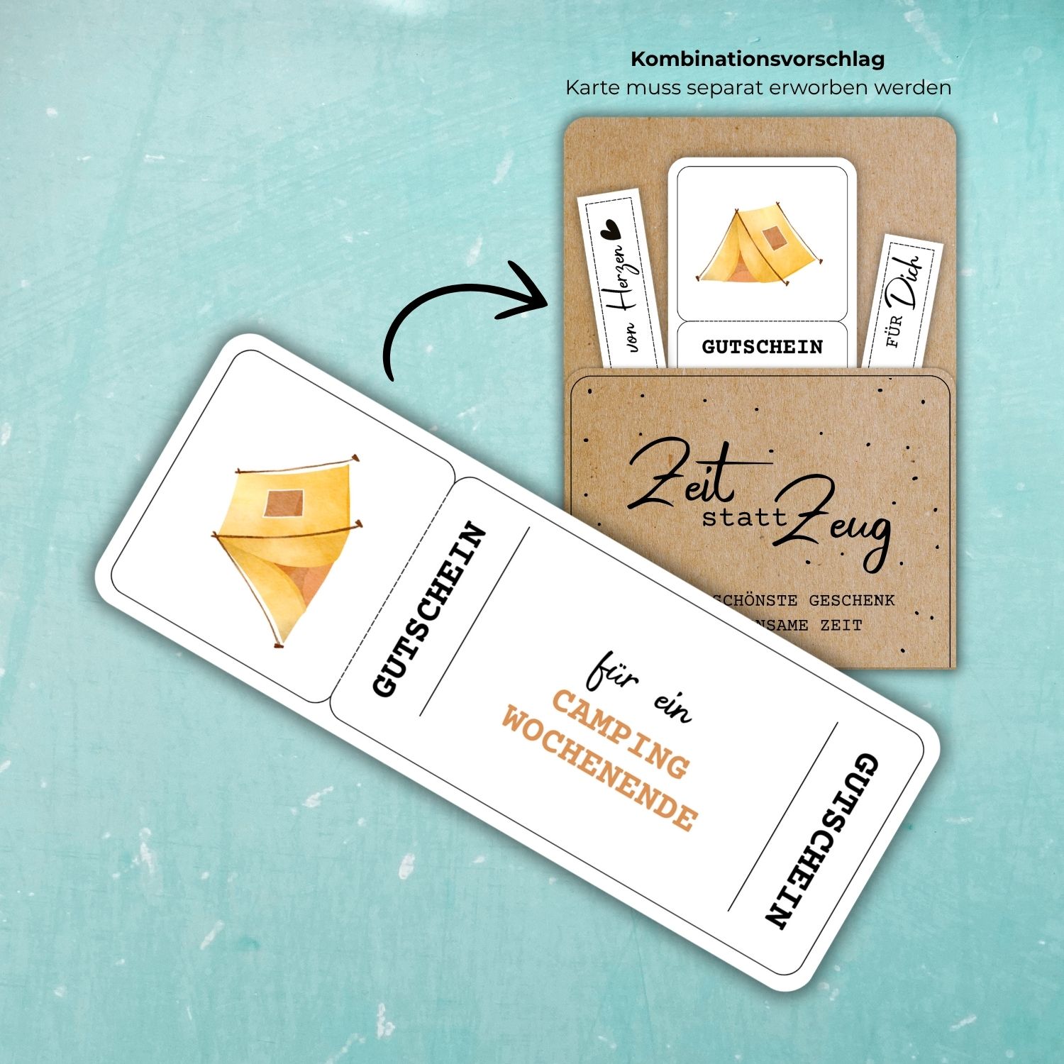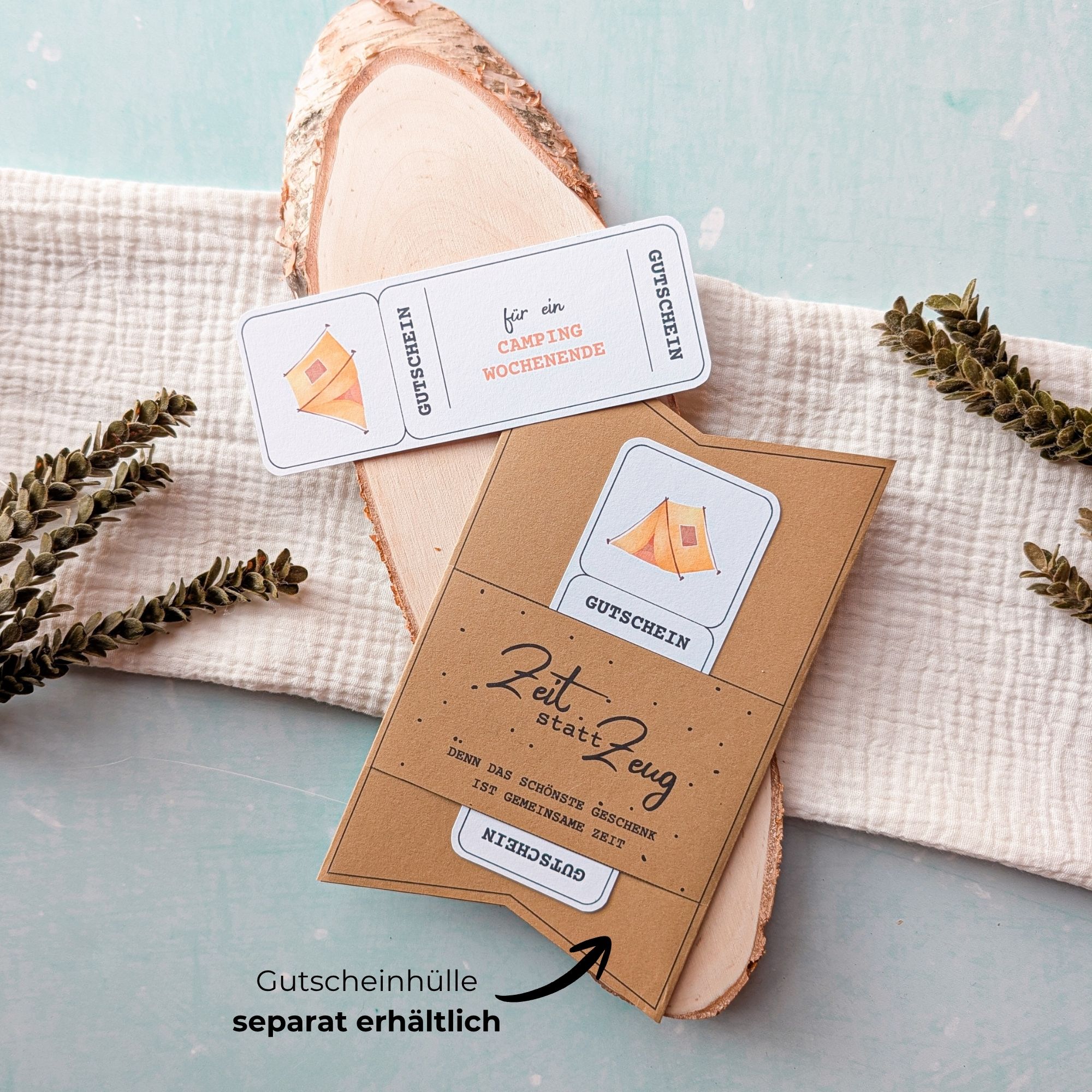 Egal ob für einen Geburtstag, Jahrestag oder einfach als kleine Überraschung zwischendurch – durch das Kombinieren mit meinen Karten & Hüllen bekommt dein Gutschein für ein Camping Wochenende den letzten Feinschliff. Alle Motive sind liebevoll gestaltet und passen perfekt zum Gutschein.