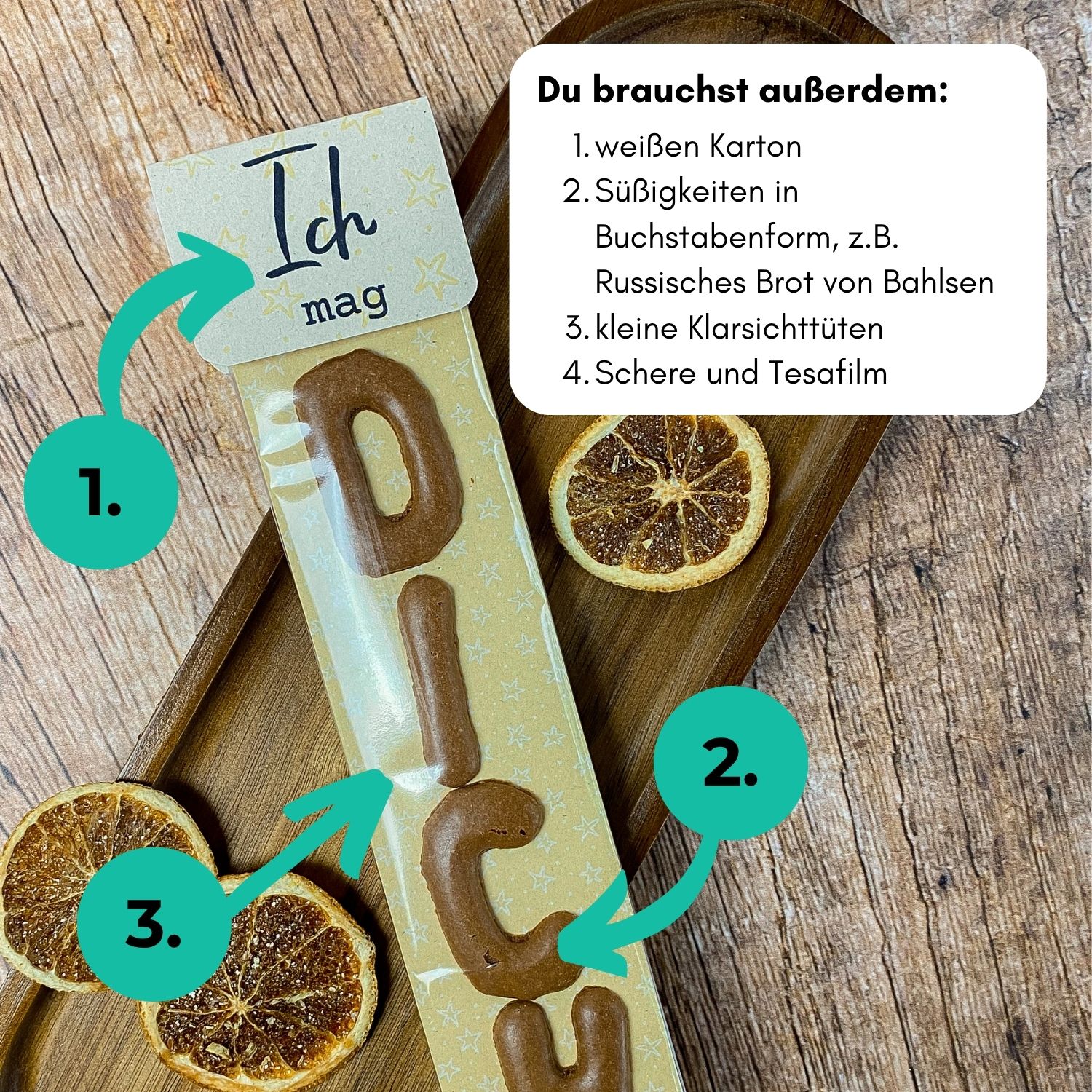Lustige Geschenkidee zum Ausdrucken: Diese liebevoll gestaltete „Ich mag dich“ Geschenkvorlage zum Ausdrucken ist die perfekte kleine Aufmerksamkeit für die Adventszeit. Kombiniert mit den Buchstaben-Süßigkeiten (z. B. Russisches Brot von Bahlsen) entsteht daraus der Satz „Ich mag DICH“ – süß, charmant und ideal als kleine Geste im Adventskalender oder für zwischendurch.