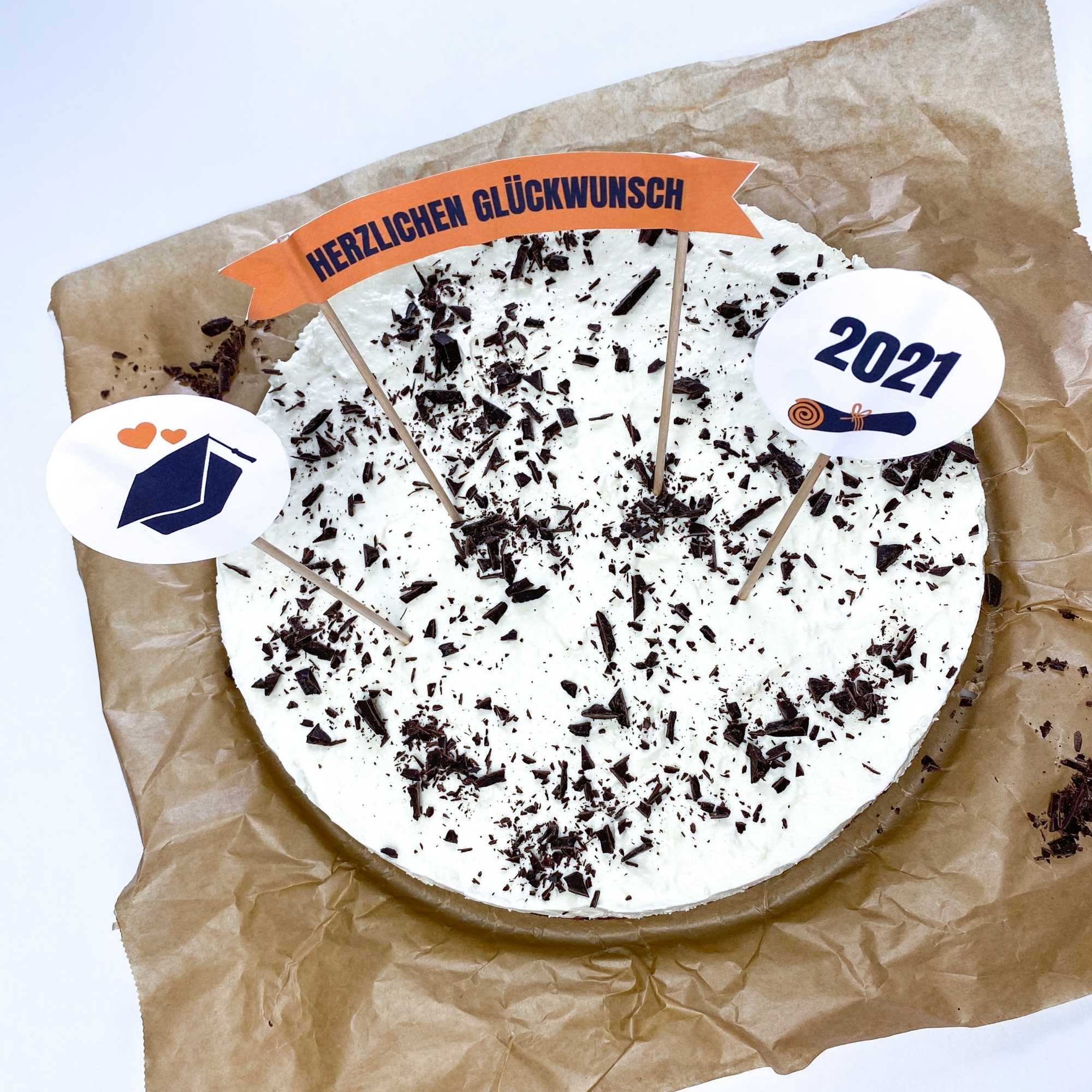 Caketopper ausschneiden, an Spießen befestigen und in den Kuchen stecken.