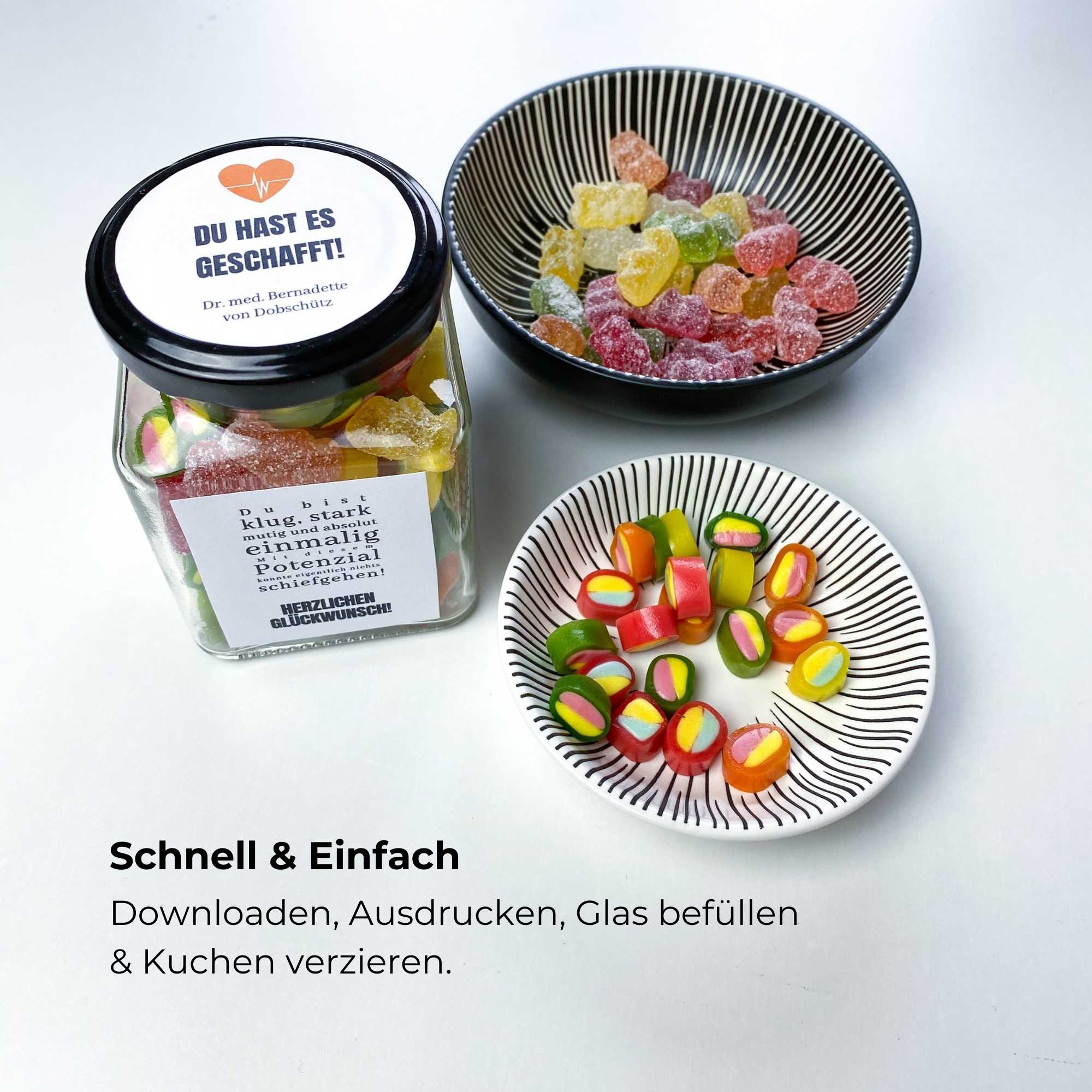 Das Glas nach Wunsch füllen – z. B. mit Gummibärchen, Schoki, kleinen Notizen oder Geldscheinen.