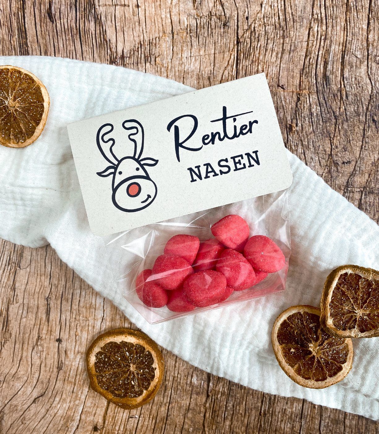 Ein süßes kleines DIY-Geschenk mit Weihnachtscharme: Mit dieser liebevoll gestalteten Druckvorlage bastelst du im Handumdrehen ein witziges Mitbringsel – „Rentiernasen“! Einfach eine Klarsichttüte (z. B. von dm) mit roten Schaumküssen oder ähnlichen Süßigkeiten füllen, die Vorlage oben anbringen und schon entsteht eine charmante Kleinigkeit mit Wow-Effekt.