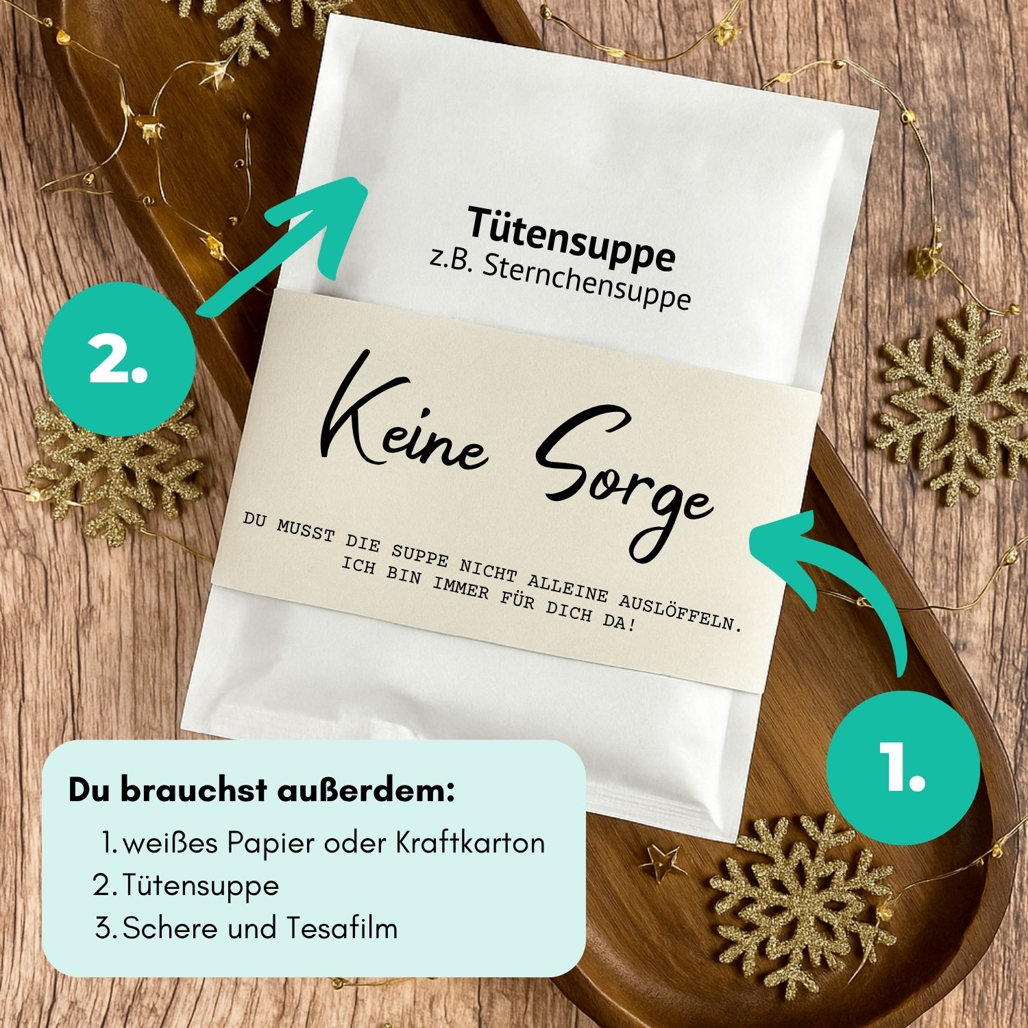 Lustige Geschenkidee zum Ausdrucken: Diese liebevoll gestaltete Tütensuppe Geschenkidee zum Ausdrucken verwandelt eine einfache Suppentüte in eine kleine Auszeit für den Alltag. Mit einem Ausdruck, etwas stärkerem Papier und wenigen Bastelschritten entsteht ein charmantes Mitbringsel – perfekt für kalte Tage, stressige Stunden oder einfach als liebevolle Geste.