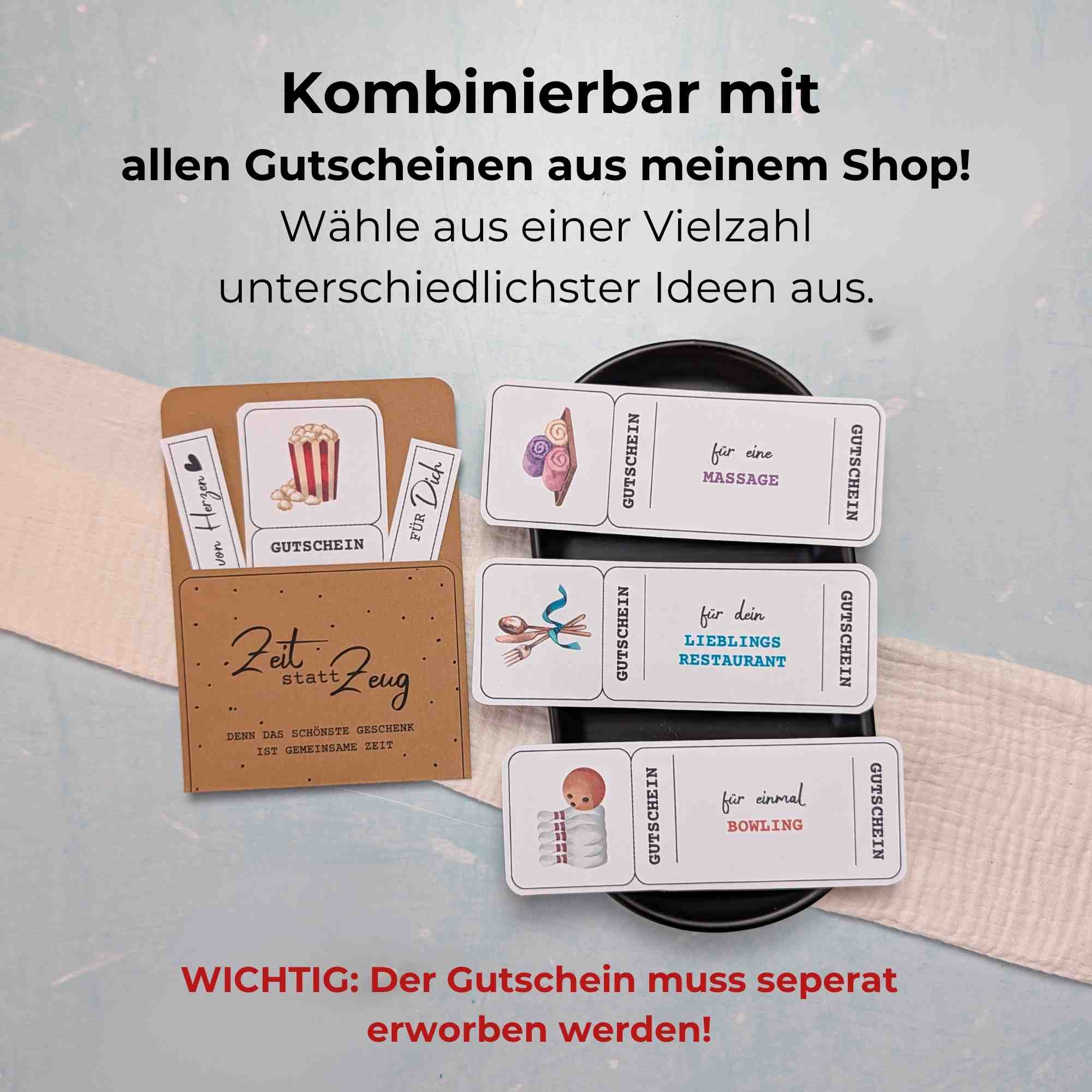 In deiner Zeit statt Zeug Gutscheinverpackung kannst du gleich mehrere kleine Erlebnisse einpacken und daraus einen rundum besonderen Tag machen. Zum Beispiel so: